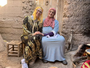 Once she was done helping us, she went back to the fire, where she was cooking Khobz (a type of bread) for us to eat. There wasn’t enough room around the table set up for all her guests, so she indicated for me to sit next to her. I was really hesitant at first, because I didn’t quite feel like it was my place to sit there with her, but she kept motioning for me to come over. I sat down and she held my hands while we learned about the tea that this region drinks. It’s a peppermint green tea, but they add many other plants for various reasons. People typically drink it in the mornings or after their siesta, but I saw it served at all times of day over my travels. In order to mix the tea properly, the people pour the tea from about a foot to two feet higher than their glass and pour it back into the pot a few times before serving. The first day I tried this, I got more tea on the table than in my glass, but by the last days here, I was doing much better.